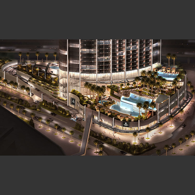Crowned with a signature rooftop lounge and restaurant, the hotel also contains a host of facilities, including a ballroom, meeting suite, spa, retail, restaurants, bars, lounges and a triple tiered pool deck.