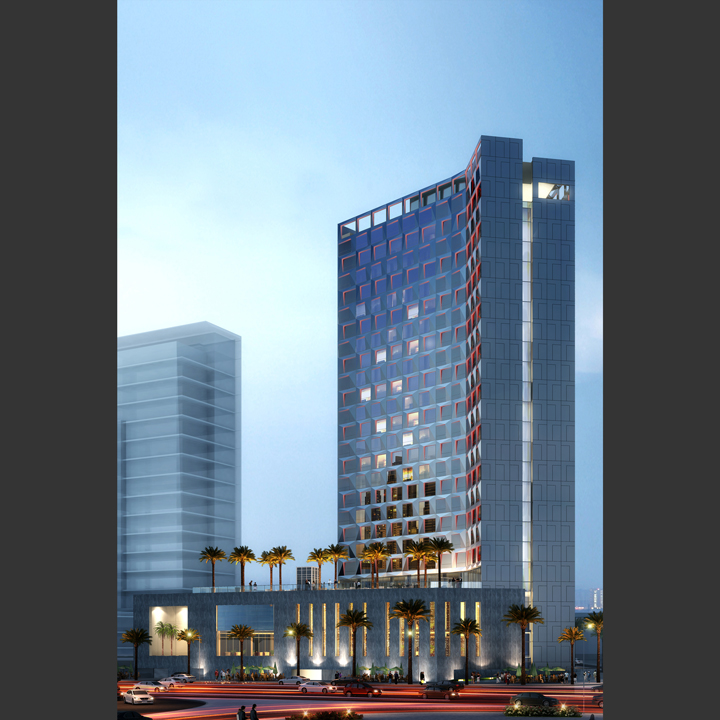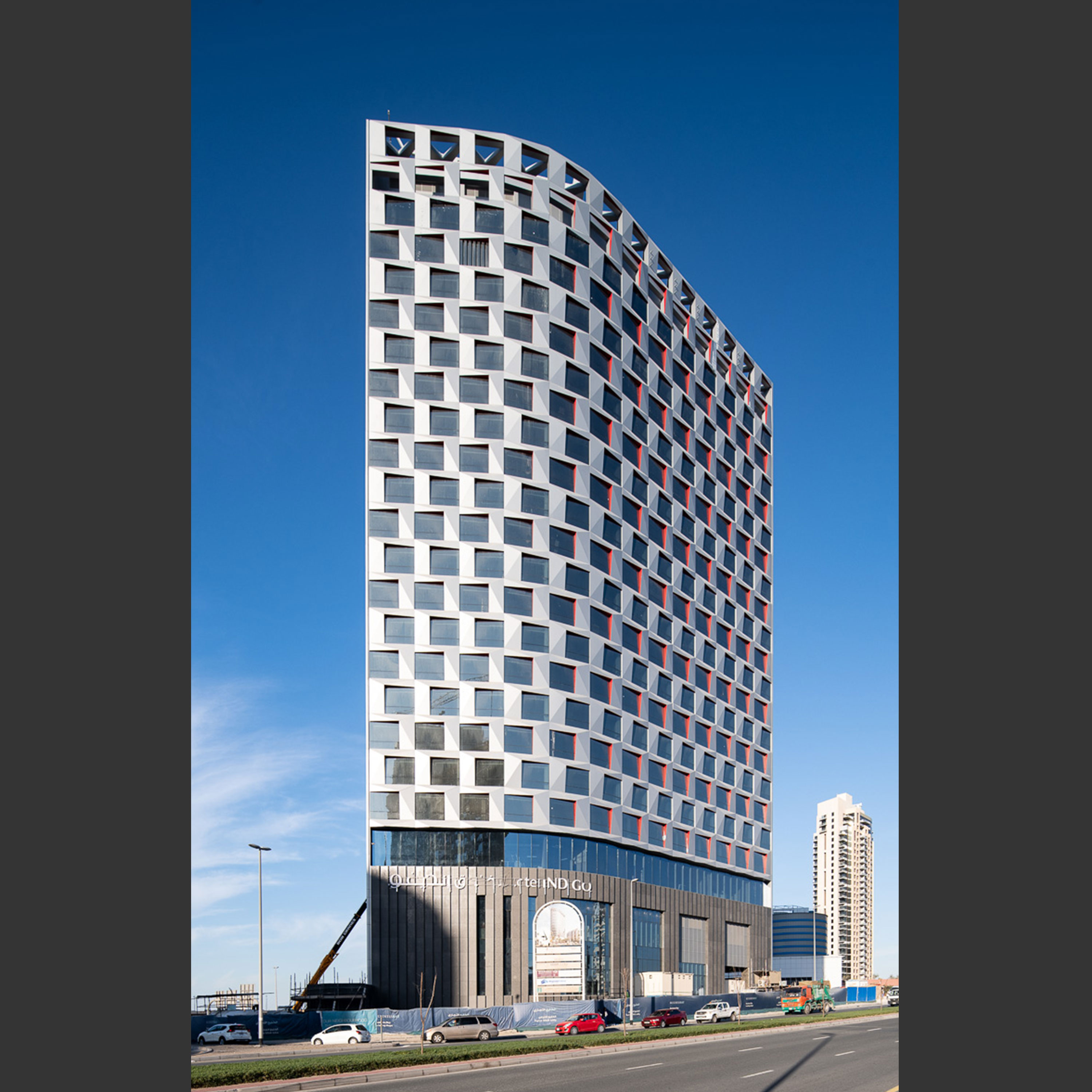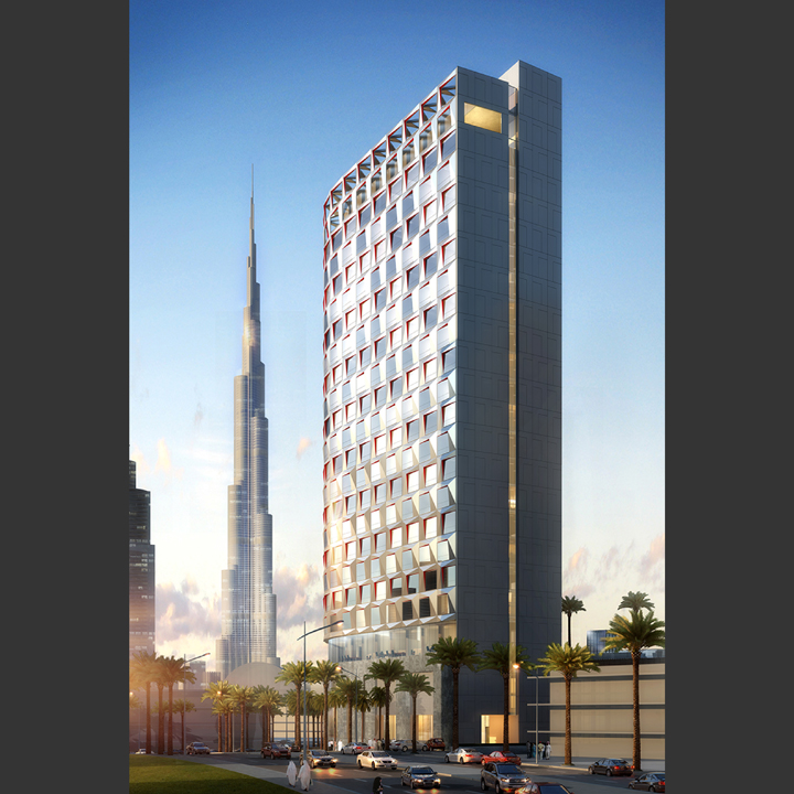Located in Business Bay, this 4-star hotel sits on a prime location, facing the creek to the south and offering dramatic views of Burj Khalifa to the west. This 20-storey tower features an undulating glass and metal exterior that playfully communicates the repetitive and capsular nature of this building. The hotel provides 240 keys and associated amenities.